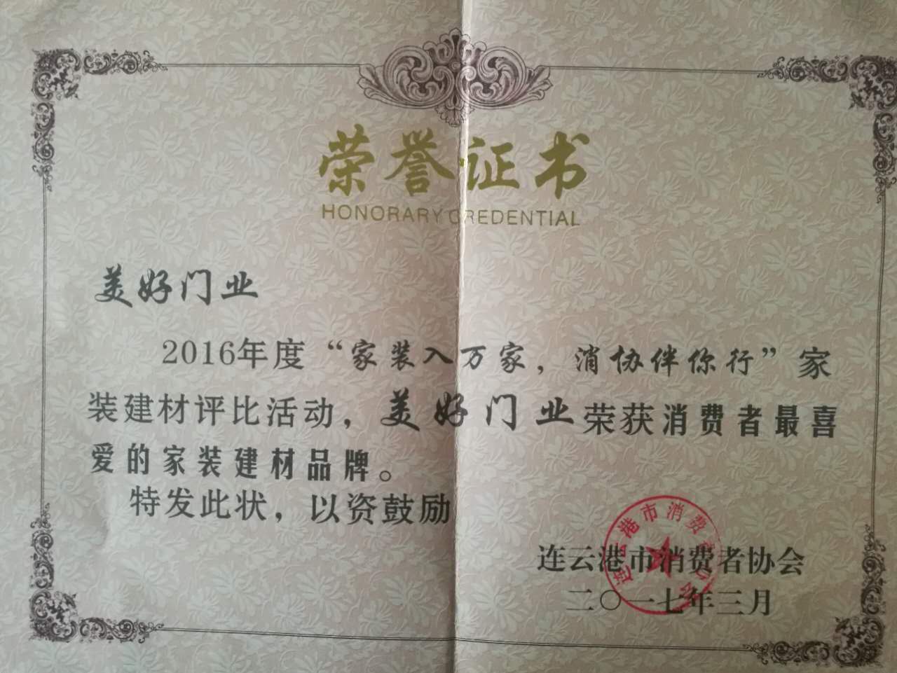 江蘇美好門業科技發展有限公司,在2016年度“家裝入萬家,消協伴您行”家裝建材評比活動中,被連云港市消費者協會授予“消費者最喜歡的家裝建材品牌”榮譽稱號。