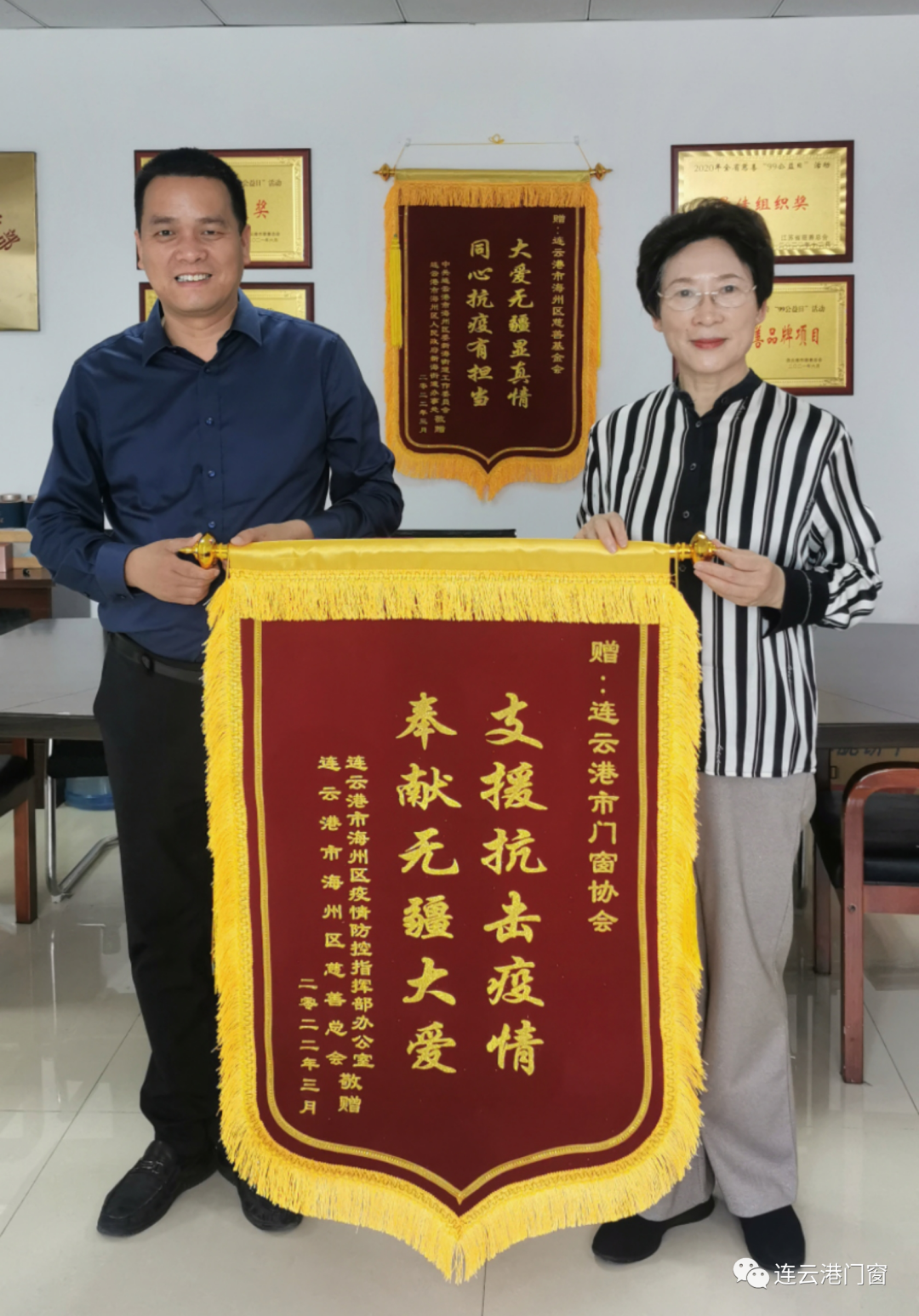 連云港市海州區政協副主席、區慈善總會會長顏景華向連云港市門窗協會黨支部書記、會長潘國柱頒發錦旗并合影留念。