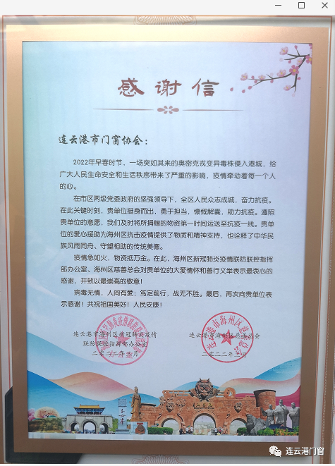 5月17日上午,連云港市海州區疫情防控指揮部辦公室、連云港市海州區慈善總會向連云港市門窗協會頒發“捐贈證書”、“感謝信”和“錦旗”。